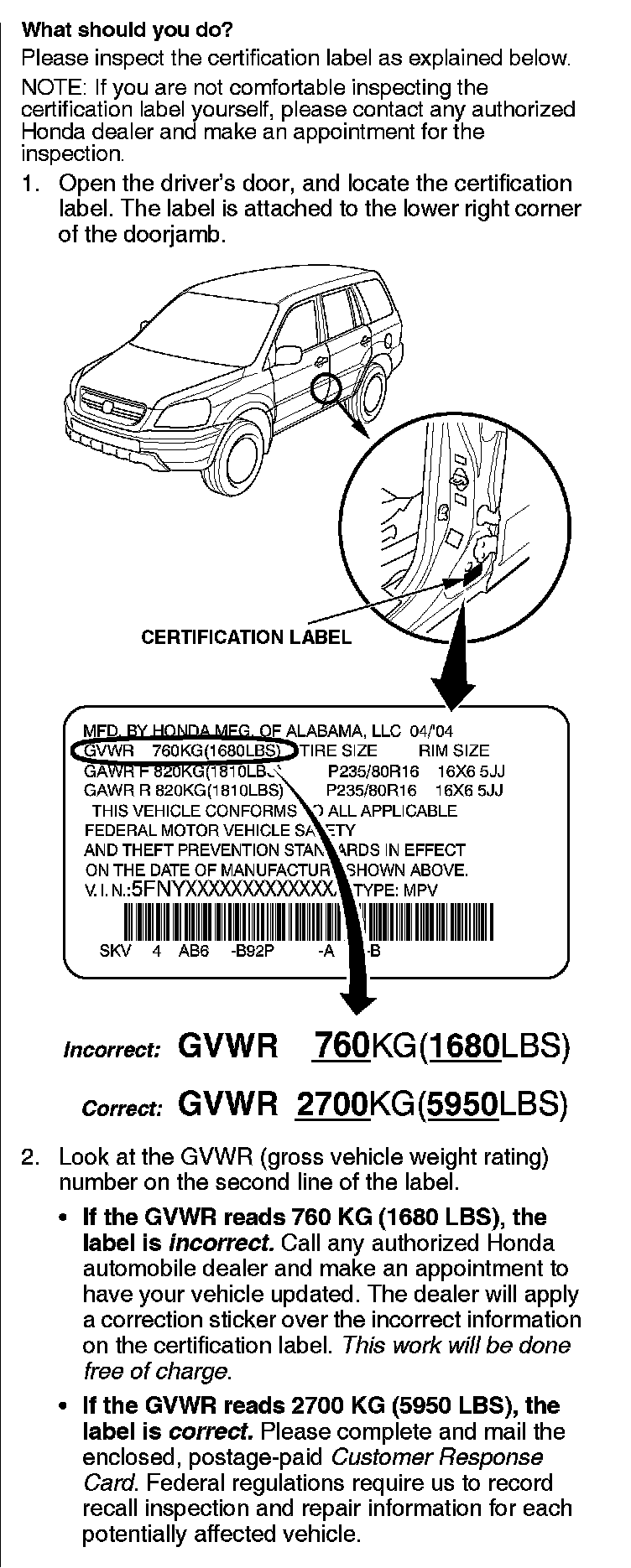 All owners of affected vehicles will be mailed a notification of this recall. In the notification, owners are asked to inspect the certification label and, if it has incorrect information, return to their dealer to have a correction sticker installed. An example of the customer notification is at the end of this service bulletin.
