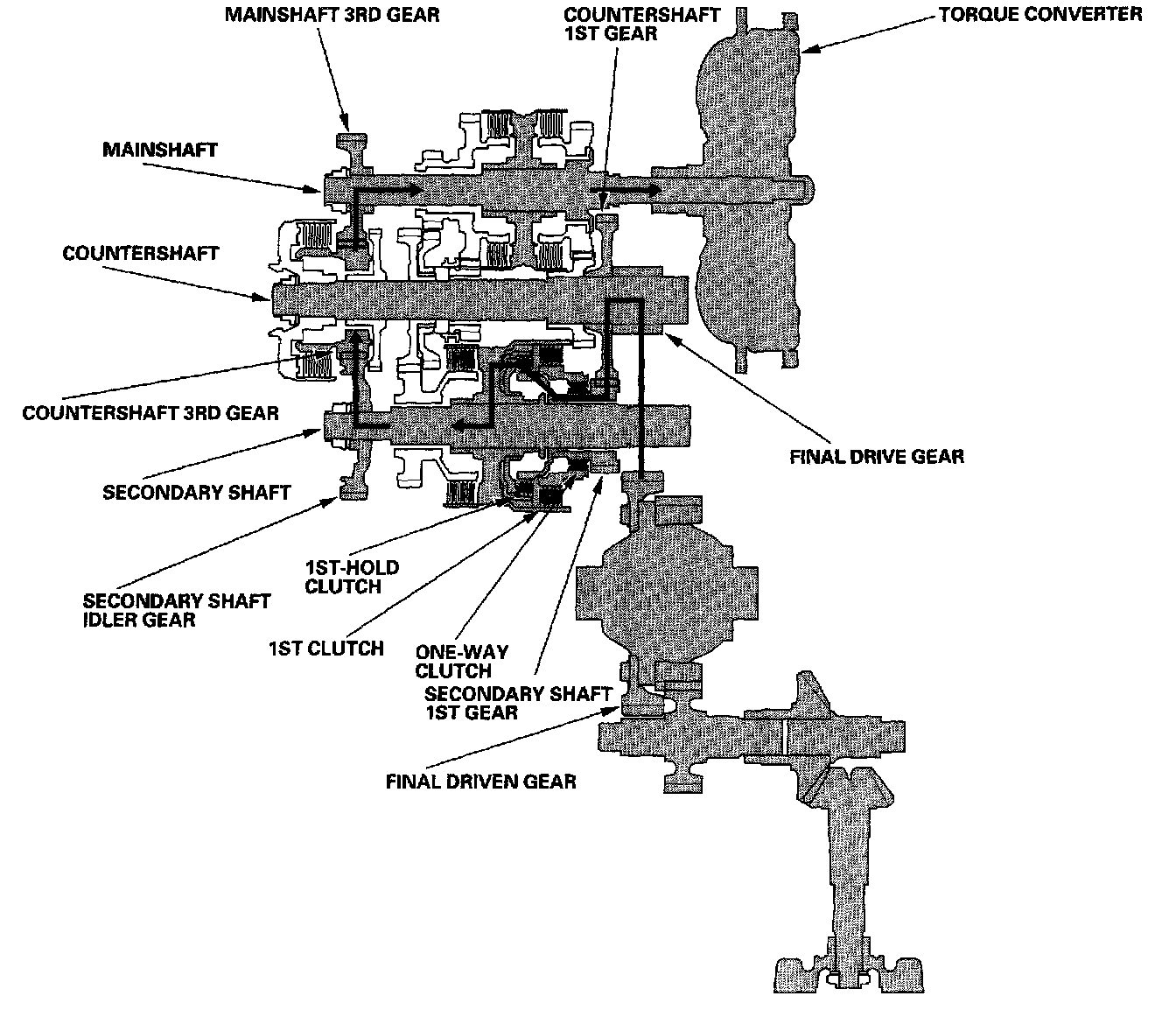 ^ Hydraulic pressure is applied to the 1st clutch and the 1st-hold clutch. Rolling resistance from the road surface goes through the front and rear wheels to the final drive gear, then to the secondary shaft idler gear.