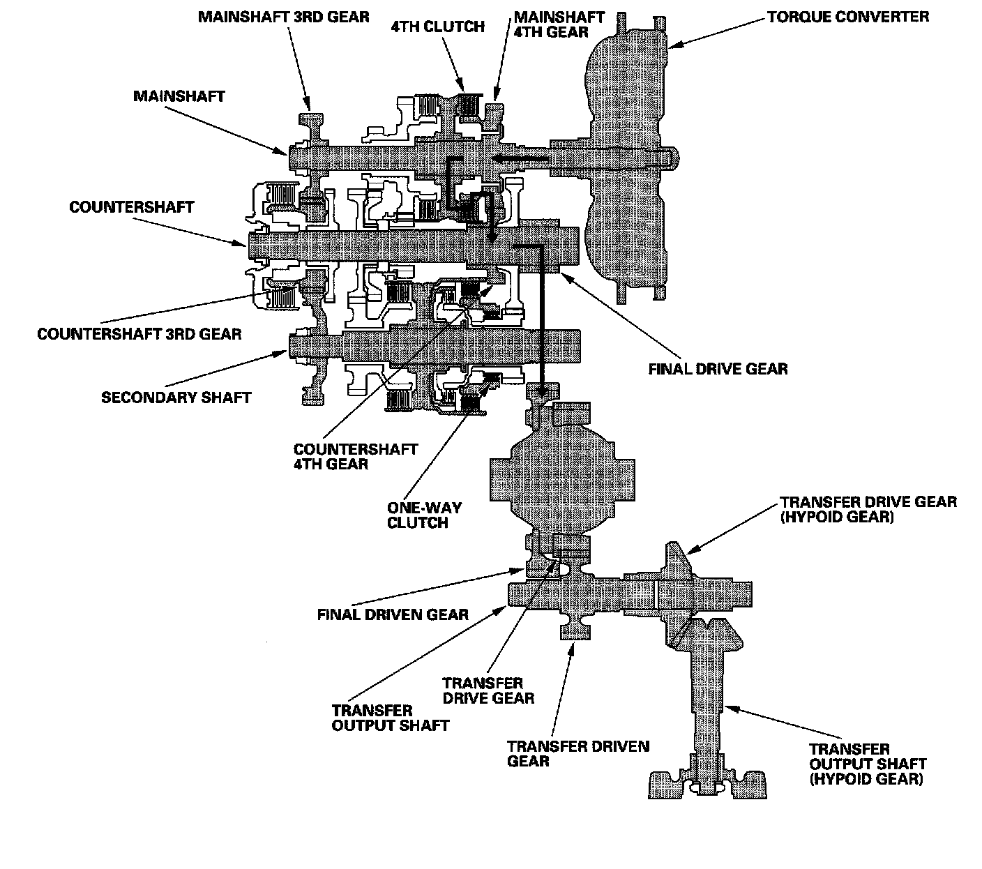 ^ Hydraulic pressure is applied to the 4th clutch, then the 4th clutch engages the mainshaft 4th gear with the mainshaft.
