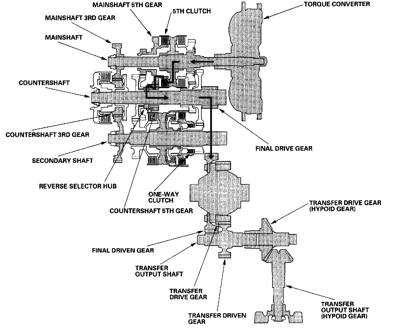 ^ Hydraulic pressure is also applied to the 5th clutch, then the 5th clutch engages the mainshaft 5th gear with the mainshaft.