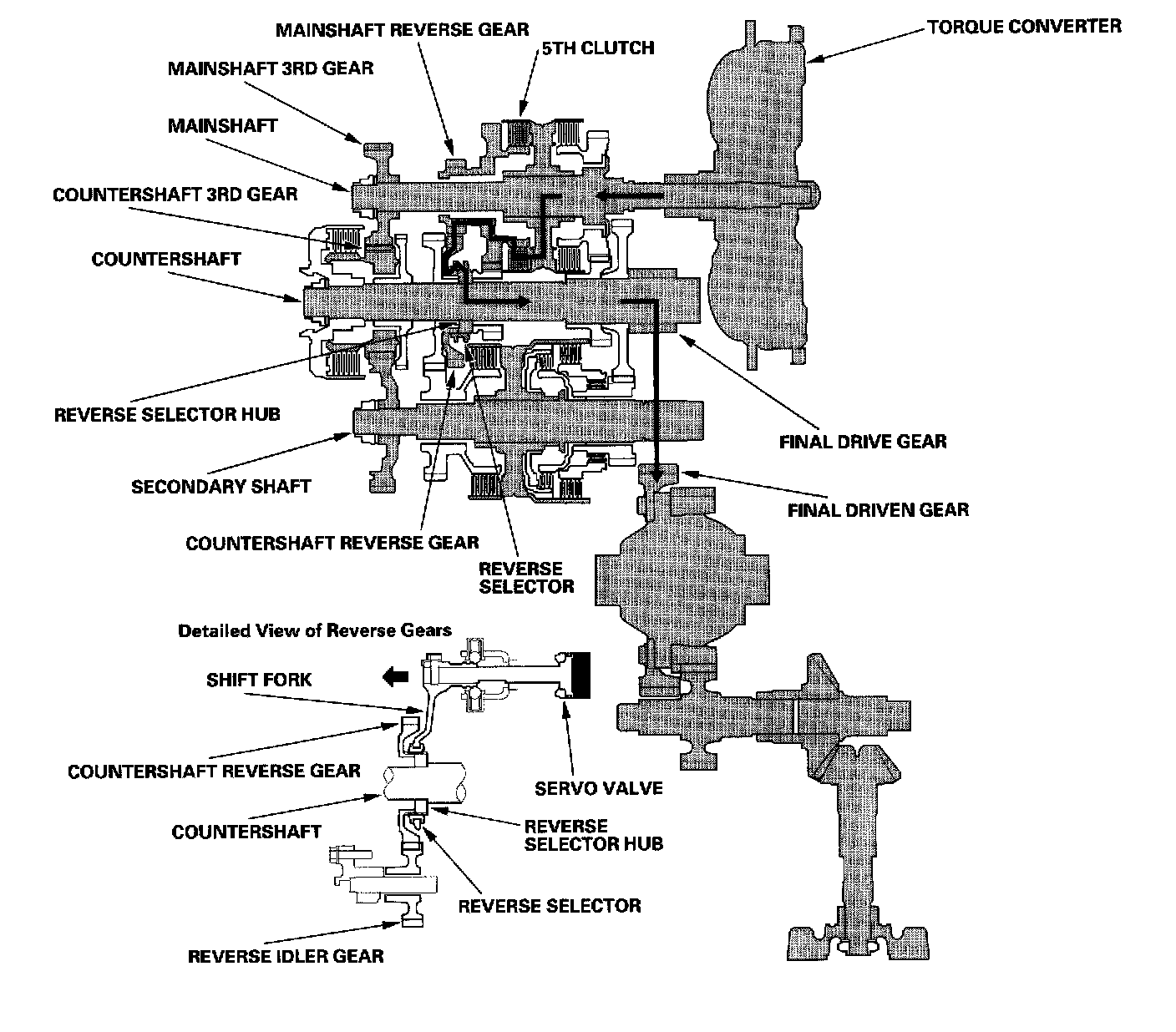 ^ Hydraulic pressure is also applied to the 5th clutch, then the 5th clutch engages the mainshaft reverse gear with the mainshaft.