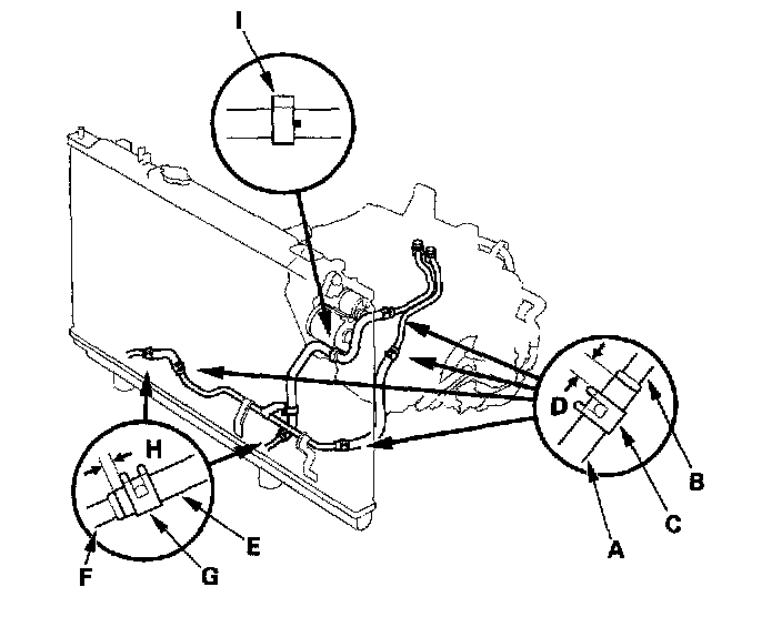 ATF Cooler Hoses Installation1. Side the ATF cooler hoses (A) over the ATF cooler lines (B), then secure the hoses with the clips (C) at 6 - 8 mm (0.2 - 0.3 inch) (D) from the hose ends.