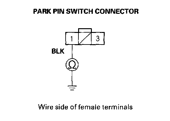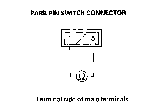 7. With the shift lever in the [P] position and pulled back toward the driver, check for continuity between the No. 1 and No. 3 terminals of the park pin switch connector.