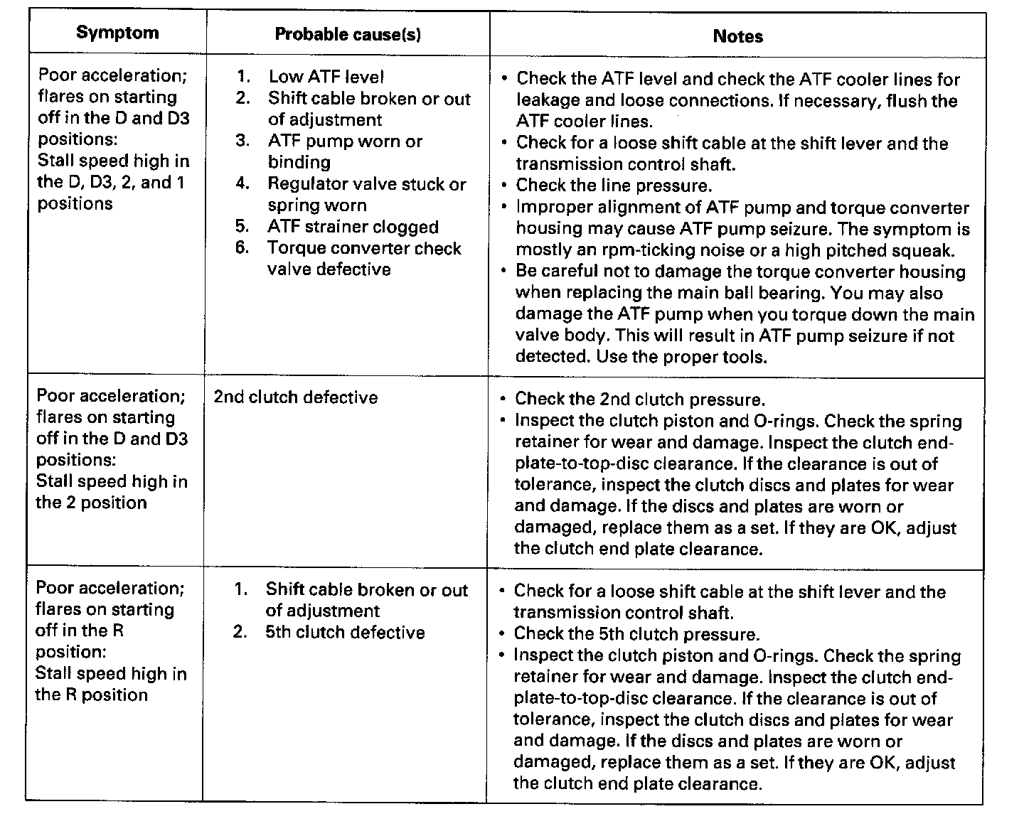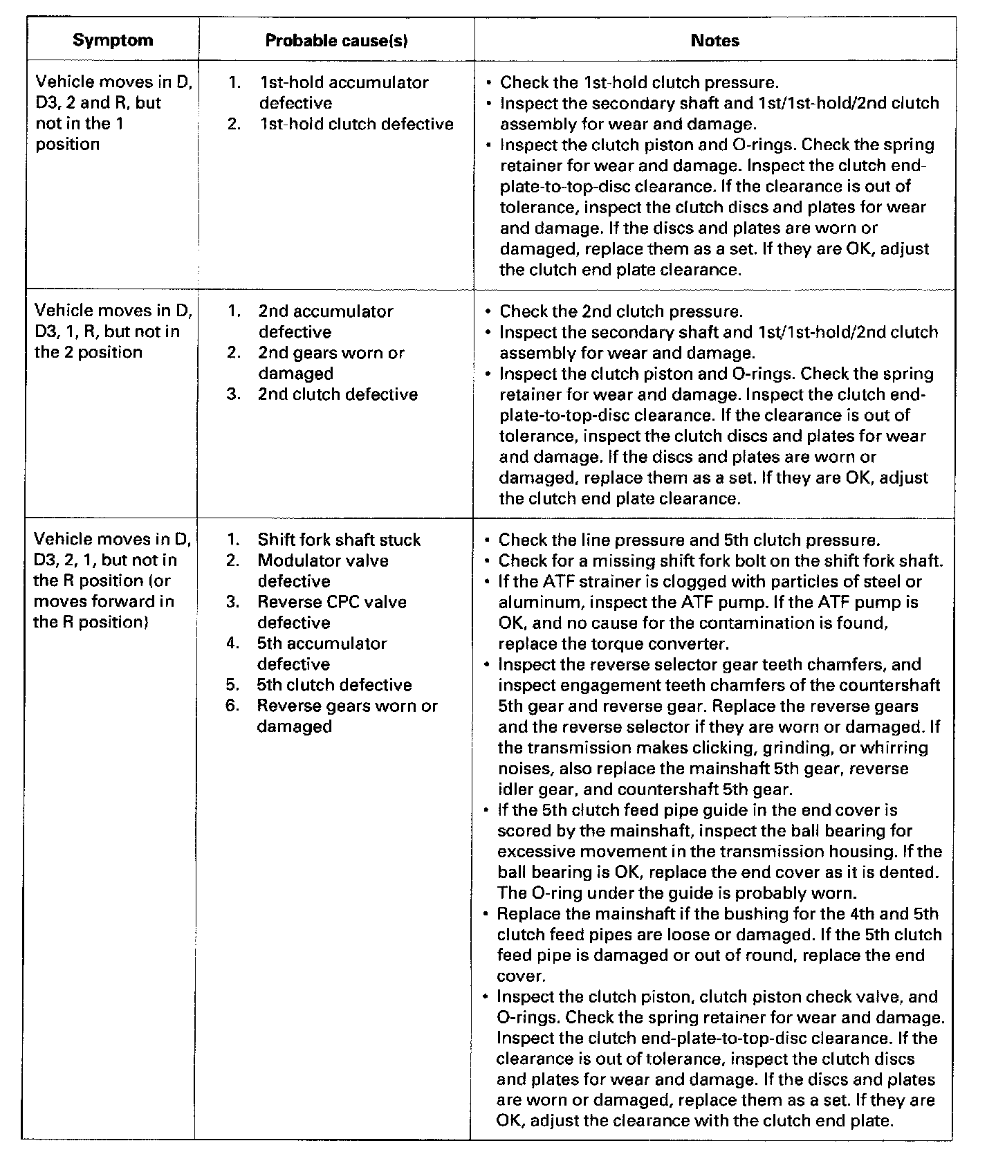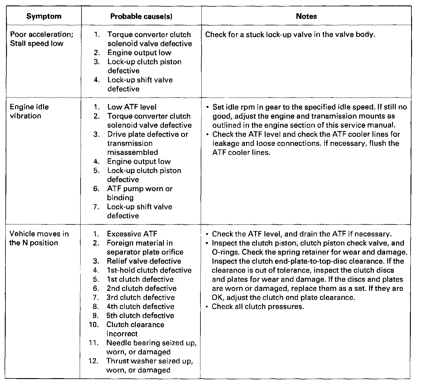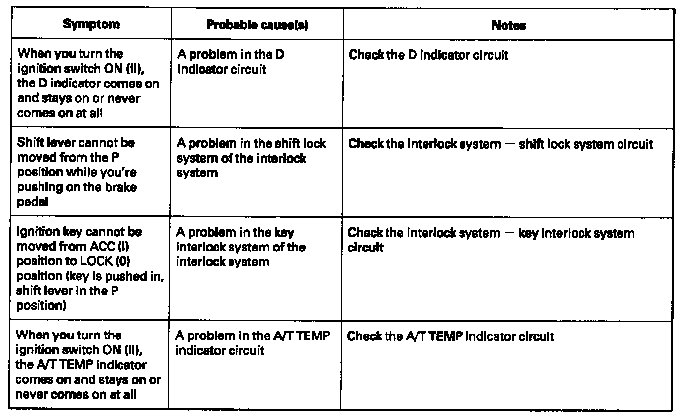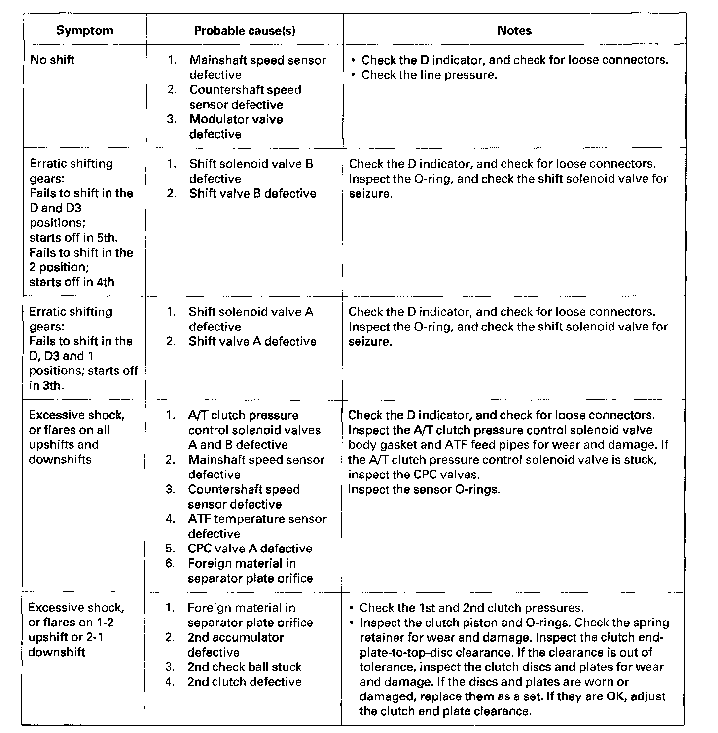These symptoms DO NOT trigger diagnostic trouble codes (DTCs) or cause the [D] indicator to blink. If the malfunction indicator lamp (MIL) was reported ON or the [D] indicator has been blinking, check for DTCs. If the vehicle has one of the symptoms in the following chart, check the probable cause(s) for it, in the sequence listed, until you find the problem.