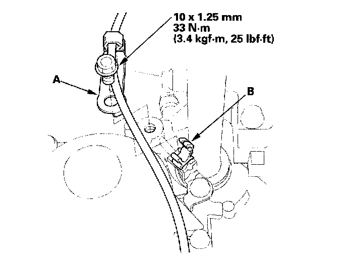 6. Install the Primary HO2S harness clamp bracket (A) on the transmission, and clamp the harness with harness clamp (B).