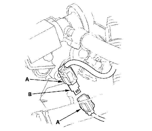 8. Connect the Primary HO2S connector (A), and install the connector on its connector bracket (B).