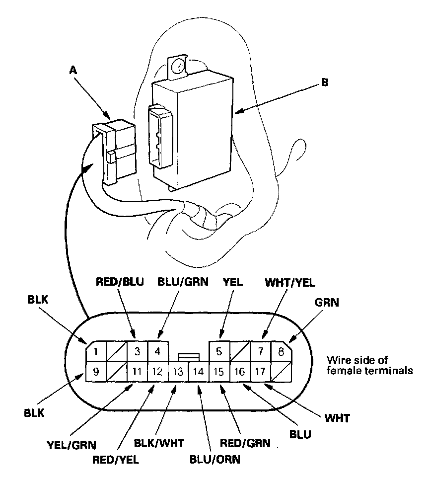 2. Disconnect the 18P connector (A) from the power window control unit (B).