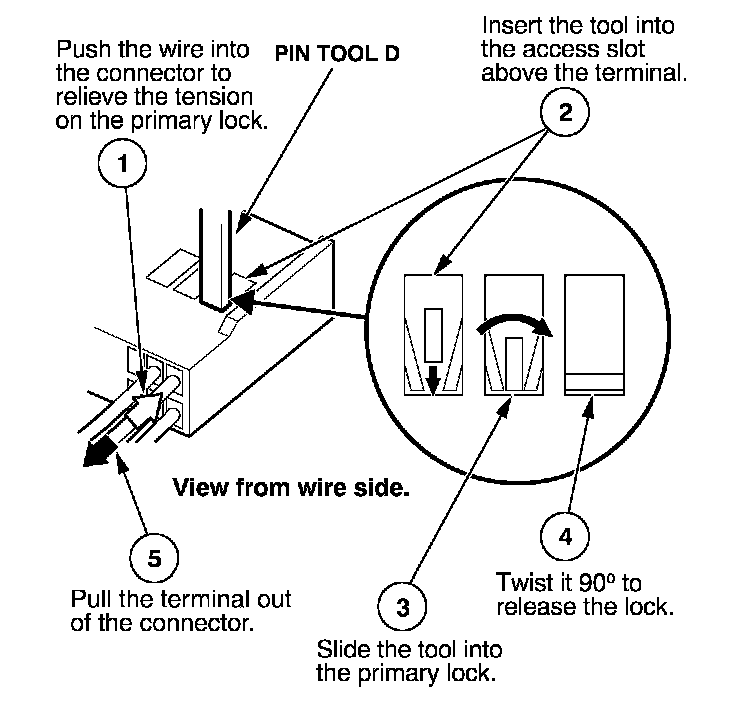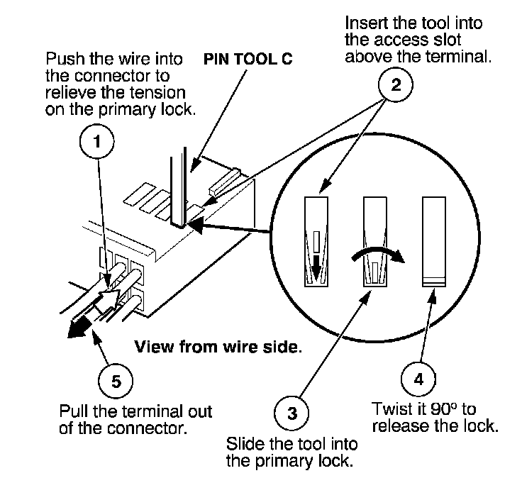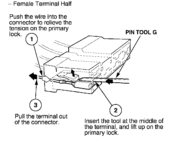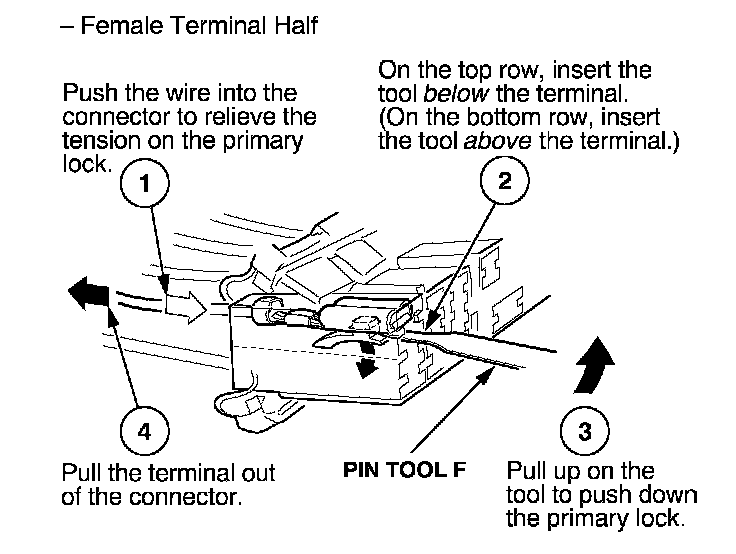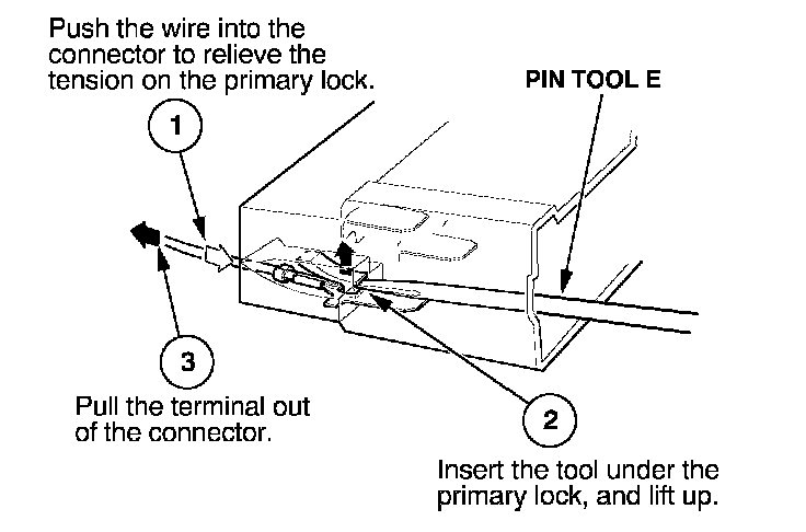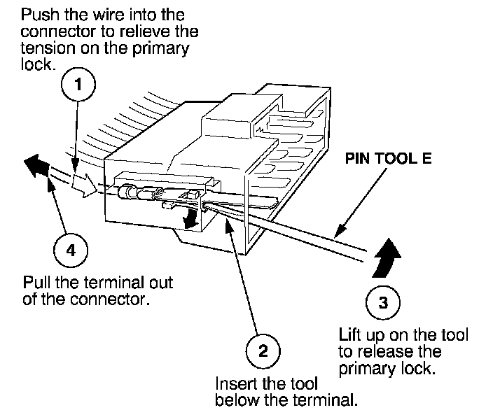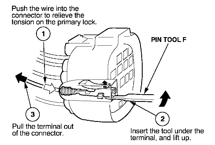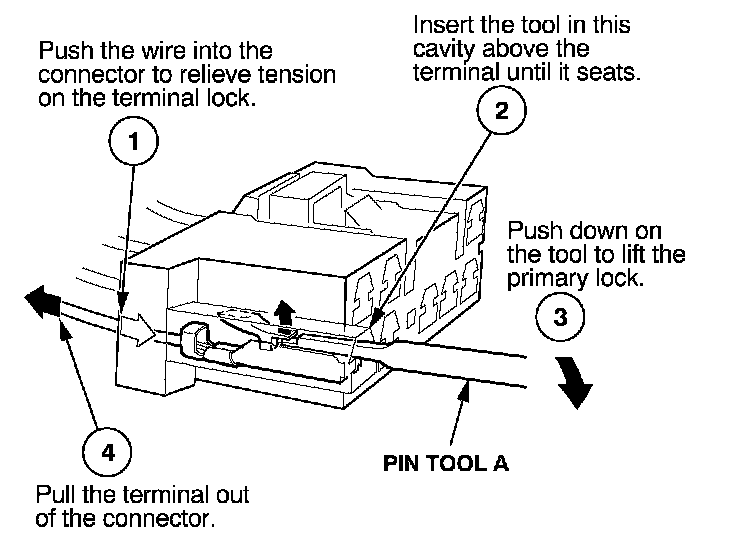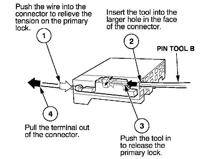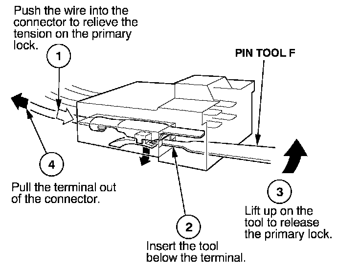 Before you begin, inspect the wire you are about to repair for damage and length. Make sure the wire will be long enough to make a terminal repair without stretching it when you reinstall the terminal in the connector. If the wire is too short, or if access to the connector is too restricted to make a terminal repair, you may need to install a pigtail terminal (a short length of wire with a factory-crimped terminal on it). Refer to HOW TO INSTALL PIGTAIL TERMINALS.