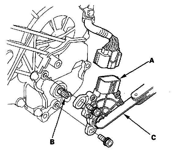 8. Install the transmission range switch (A) gently on the selector control shaft (B) with holding it in the N position with the 2.0 mm (0.08 inch) blade (C).