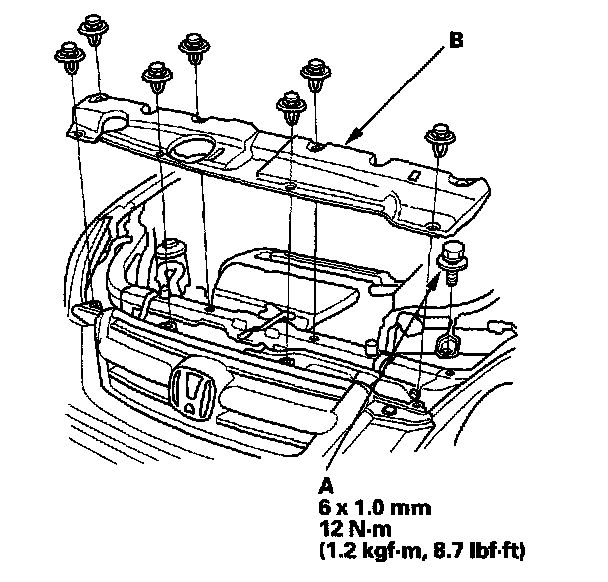 3. Remove the bolt (A) securing the battery clamp, then remove the bulkhead cover (B).