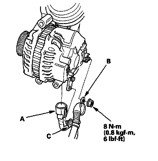 8. Disconnect the alternator connector (A) and BLK wire (B), and remove the harness clamp (C) from the alternator.