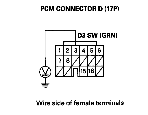 7. Measure the voltage between PCM connector terminal D3 and body ground.