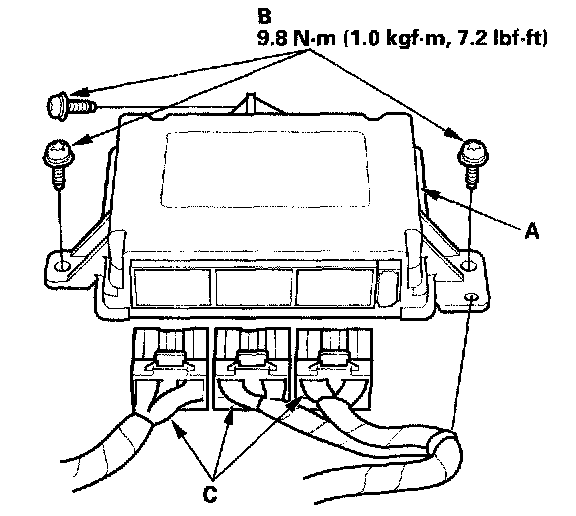 1. Install the new SRS unit (A) with Torx bolts (B), then connect the connectors (C) to the SRS unit; push them into position until they click.
