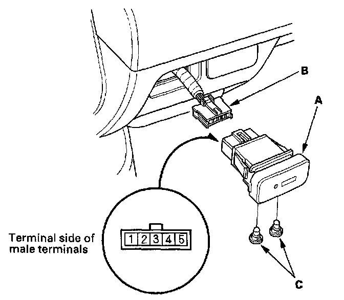 Cruise Control Master Switch Test/Replacement1. Release the clips of the switch and push the switch (A) out of the panel, then disconnect the 5P connector (B) from the master switch.