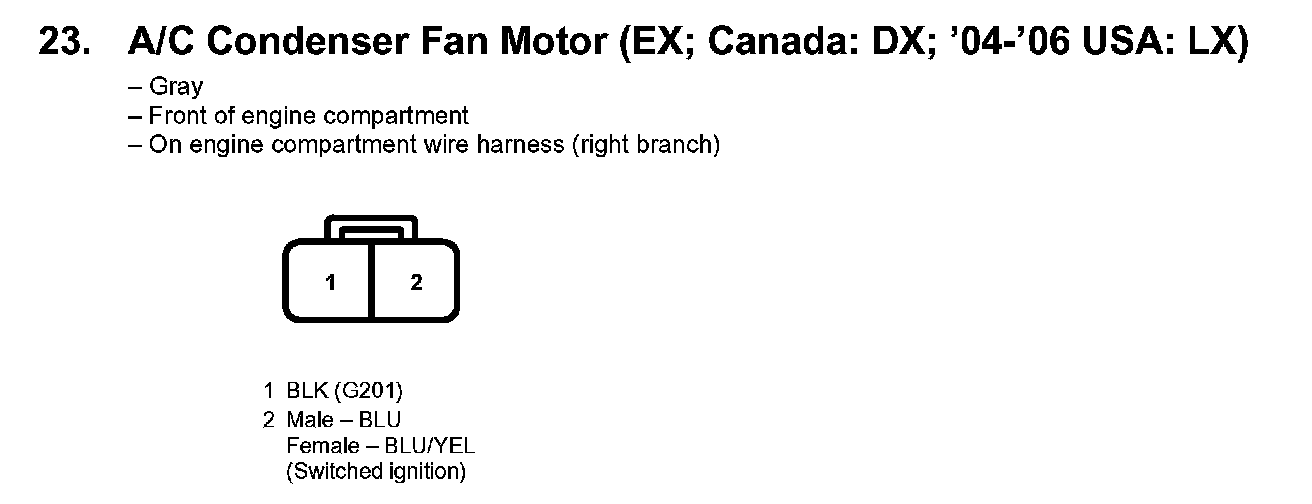 23. A/C Condenser Fan Motor (EX; Canada: DX; '04-'06 USA: LX):