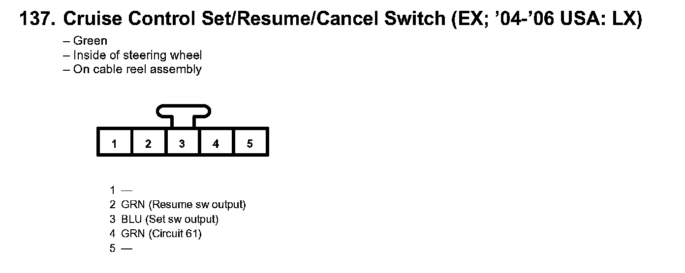137. Cruise Control Set/Resume/Cancel Switch (EX; '04-'06 USA: LX):