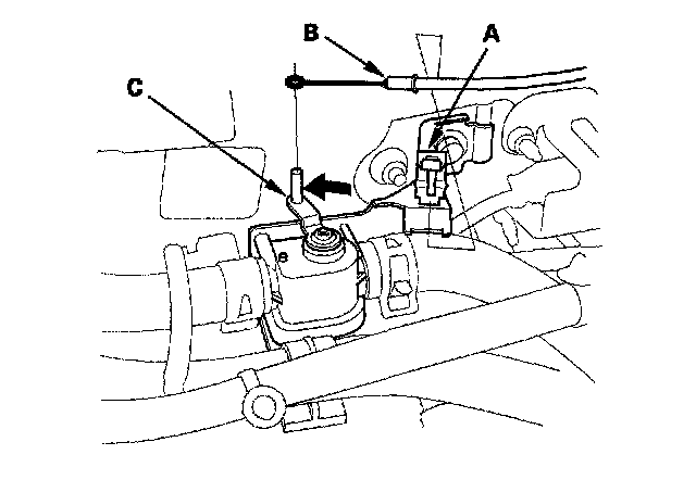 4. From under the hood, open the cable clamp (A), then disconnect the heater valve cable (B) from the heater valve arm (C). Turn the heater valve arm to the fully opened position as shown.