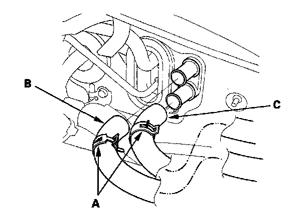 6. Slide the hose clamps (A) back, then disconnect the inlet heater hose (B) and the outlet heater hose (C) from the heater core. Engine coolant will run out when the hoses are disconnected; drain it into a clean drip pan. Be sure not to let coolant spill on the electrical parts or the painted surfaces. If any coolant spills, rinse it off immediately.