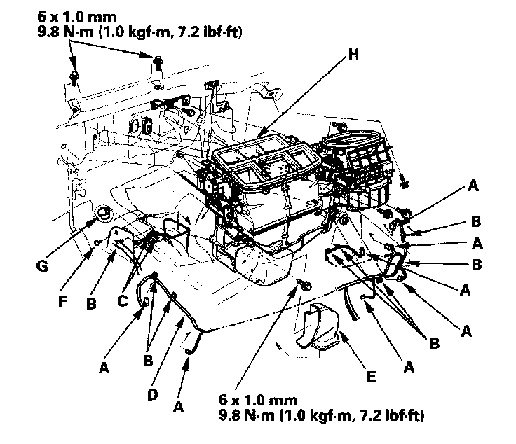10. Disconnect the connectors (A) from the dashboard wire harness, the air mix control motor, the evaporator temperature sensor, the power transistor, the mode control motor, the blower motor, and the recirculation control motor, then remove the wire harness clips (B), the connector clips (C), the wire harness (D), the heater duct (E), and the clip (F). Disconnect the drain hose (G), then remove the mounting nuts and the blower-heater unit (H).