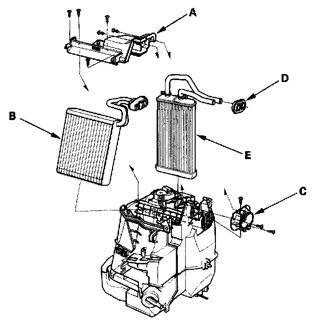 11. Remove the self-tapping screws and the expansion valve cover (A). With air conditioning; carefully pull out the evaporator core (B) so you don't bend the inlet and outlet pipes. Remove the self-tapping screws and the flange cover (C), then remove the grommet (D), and carefully pull out the heater core (E) so you don't bend the inlet and outlet pipes.