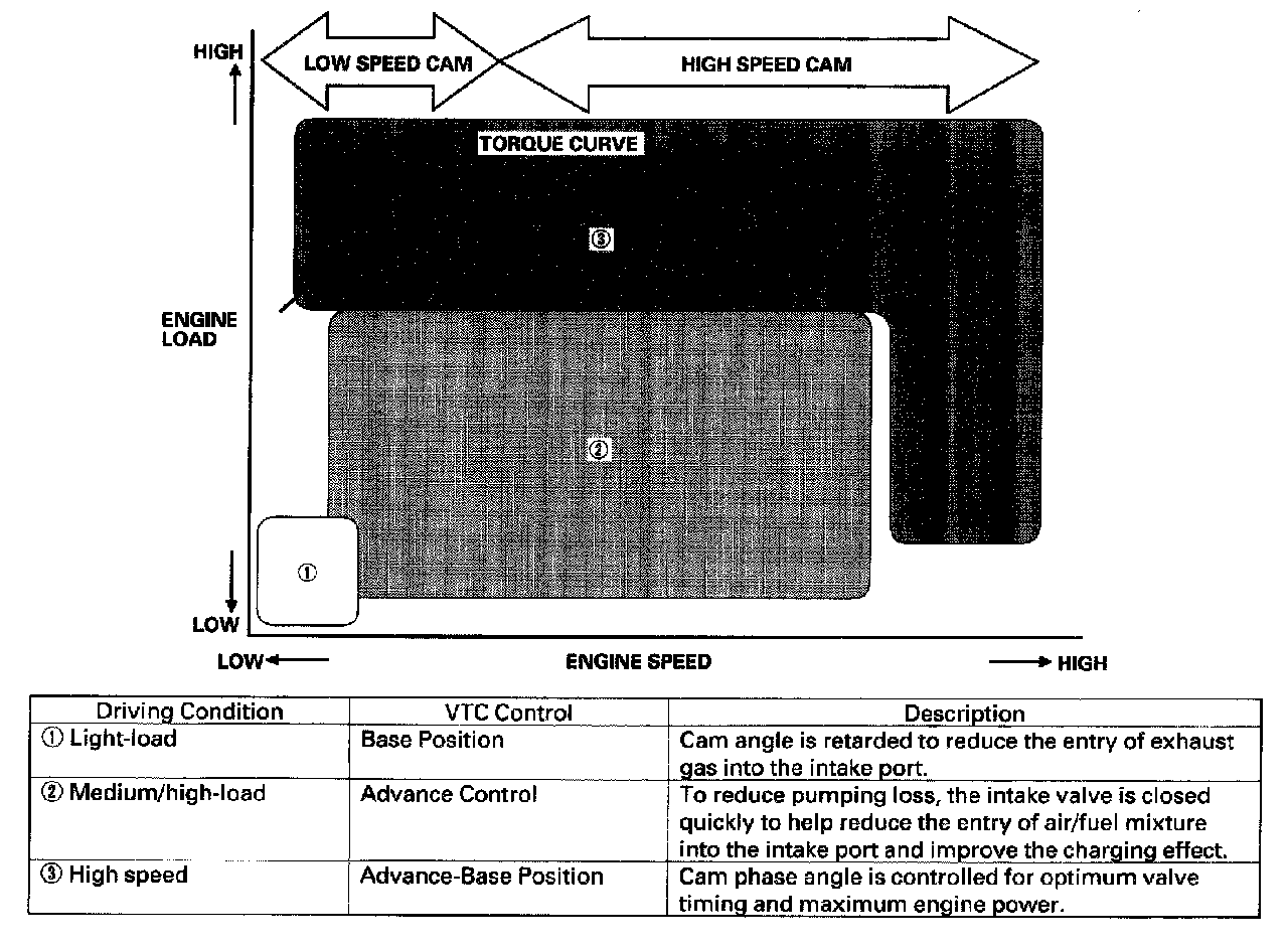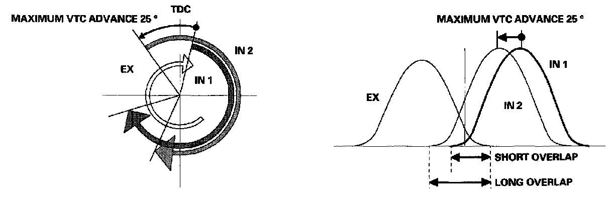 - The VTC system makes continuous intake valve timing changes based on operating conditions.