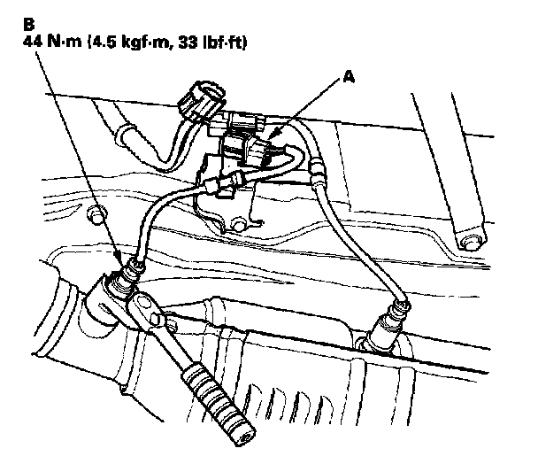 1. Disconnect the A/F sensor 4P connector (A), then remove the A/F sensor (B).