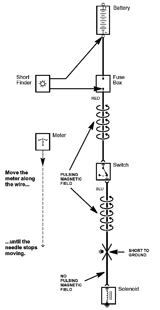 5. Beginning at the fuse box, slowly move the short finder along the circuit wiring. The meter will read current pulses through sheet metal and body trim. As long as the meter is between the fuse and the short, the needle will move with each current pulse. Once you move the meter past the point of the short, the needle will stop moving. Check the wiring and connectors in this area to locate the cause of the short.
