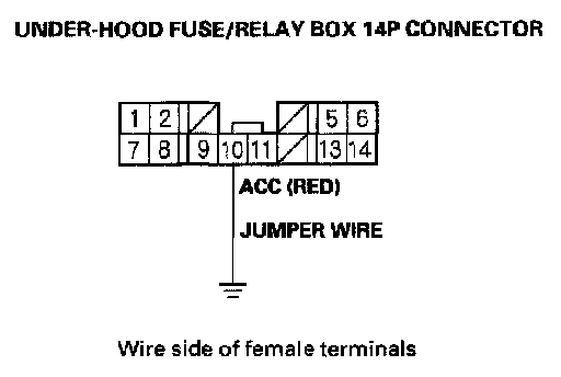 9. Momentarily connect under-hood fuse/relay box 14P connector terminal No.10 to body ground with a jumper wire several times.