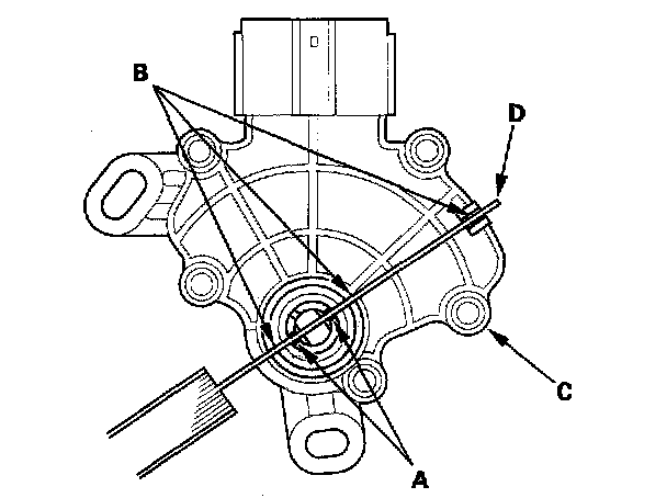 7. Align the cutout (A) on the rotary-frame with the neutral positioning cutouts (B) on the transmission range switch (C), then put a 2.0 mm (0.08 inch) feeler gauge blade (D) in the cutouts to hold it in the N position.