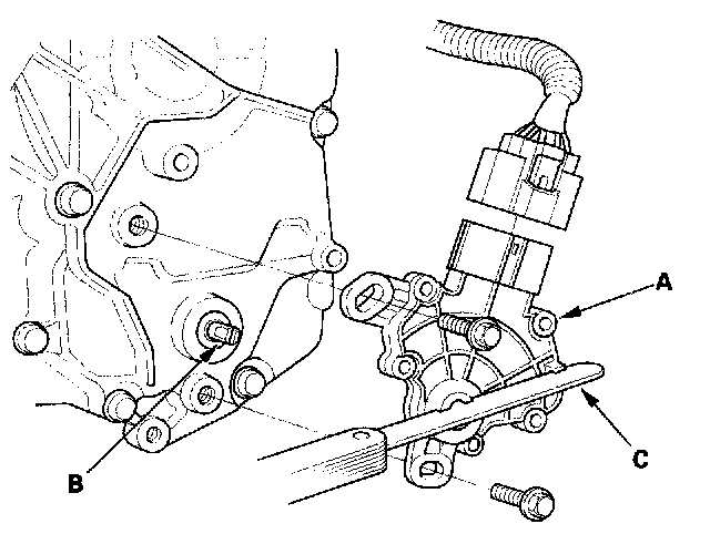 8. Install the transmission range switch (A) gently on the selector control shaft (B) while holding the N position with the 2.0 mm (0.08 inch) blade (C).