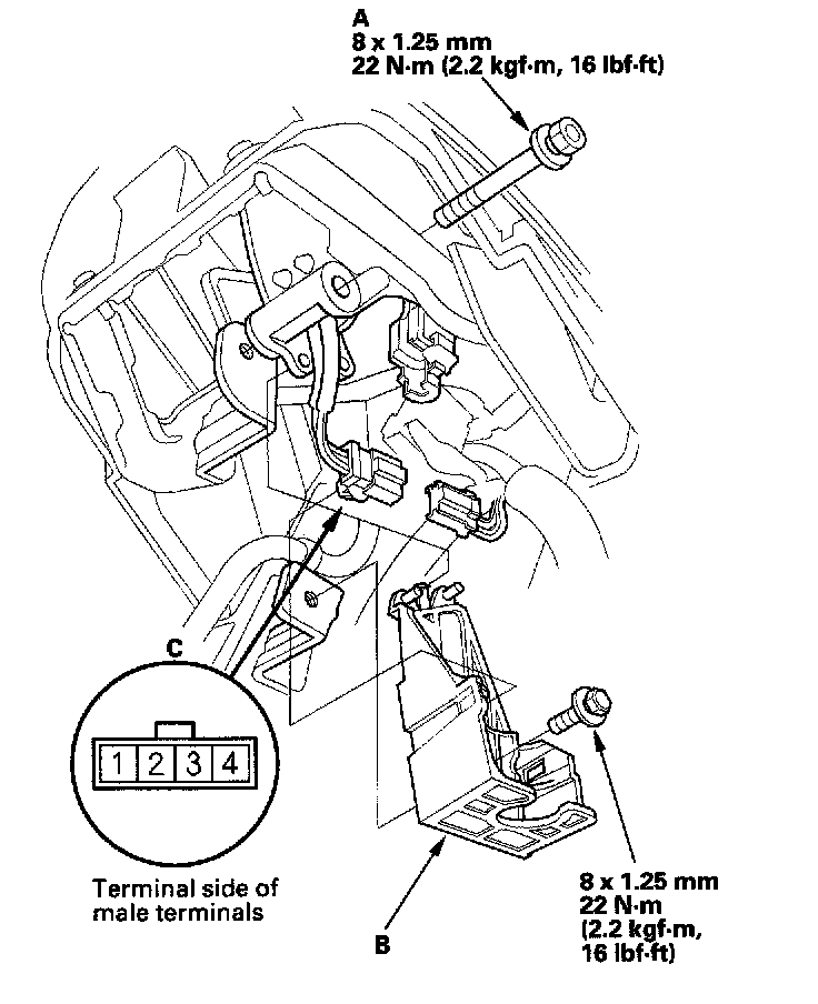 28. Install the O/D switch harness terminals (C) in the No. 1 and No. 2 cavities. Either O/D switch harness terminal can be installed in No. 1 and No. 2 cavities.
