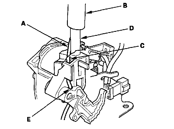 21. Insert the new O/D switch harness (A) into the shift lever ring (B), and route the harness through the groove (C) of the shift lever (D) into the hole (E). Do not pinch the harness.