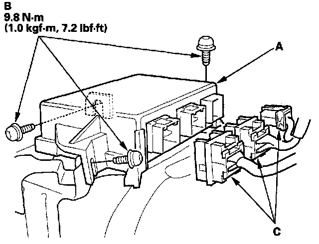 1. Install the new SRS unit (A) with Torx bolts (B), then connect the connectors (C) to the SRS unit; push them into position until they click.