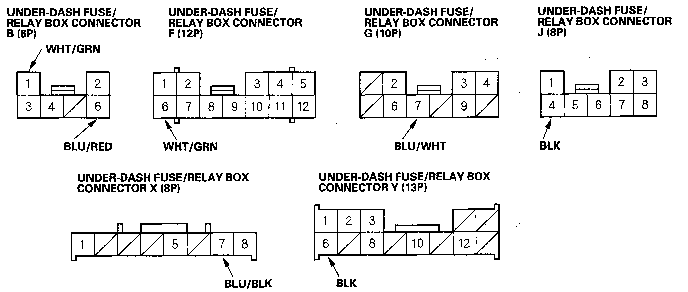 3. Disconnect the under-dash fuse/relay box connectors B, F, G, J, X and Y.