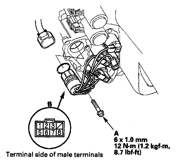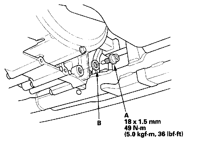 7. Remove the bolt (A), and remove the shift solenoid harness connector (B).