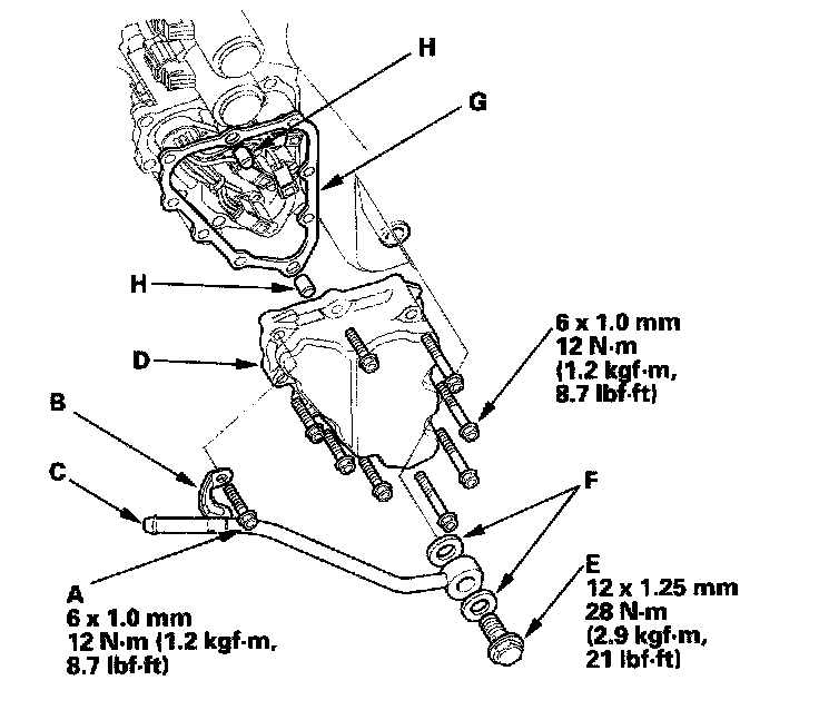 5. Remove the bolt (A) securing the bracket (B) of the ATF cooler inlet line (C) on the shift solenoid valve cover (D), and remove the line bolt (E) with sealing washers (F).