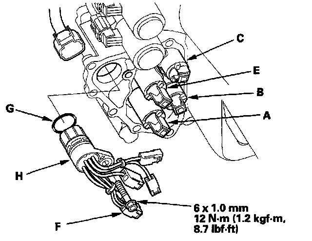 13. Install the new O-ring (G) on the shift solenoid harness connector (H), and install the connector in the transmission housing.