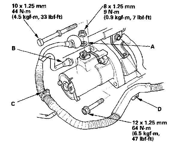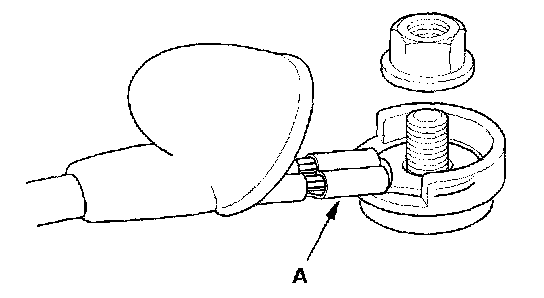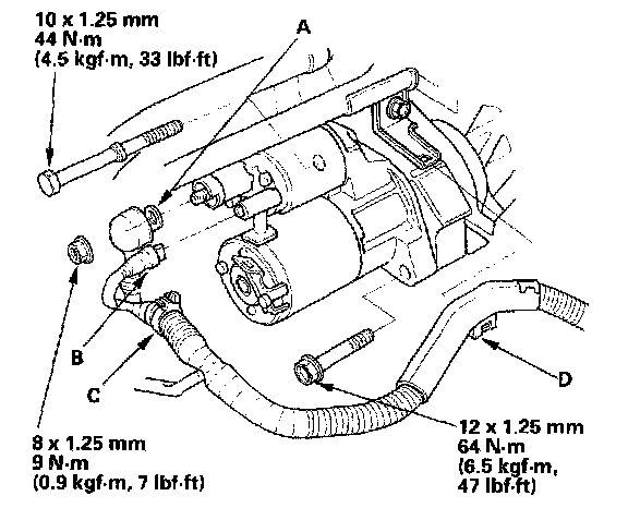 4. Disconnect the starter cable (A) from the B terminal, then disconnect the BLK/WHT wire (B) from the S terminal.