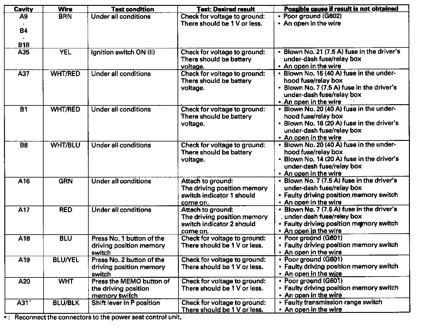 5. Reconnect the connectors to the power seat control unit. Make these input tests at the connectors.