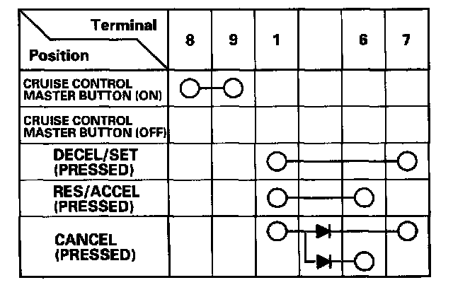 - If there is continuity and it matches the table, but switch failure occurred on the cruise control unit input test, check and repair the wire harness on the switch circuit.