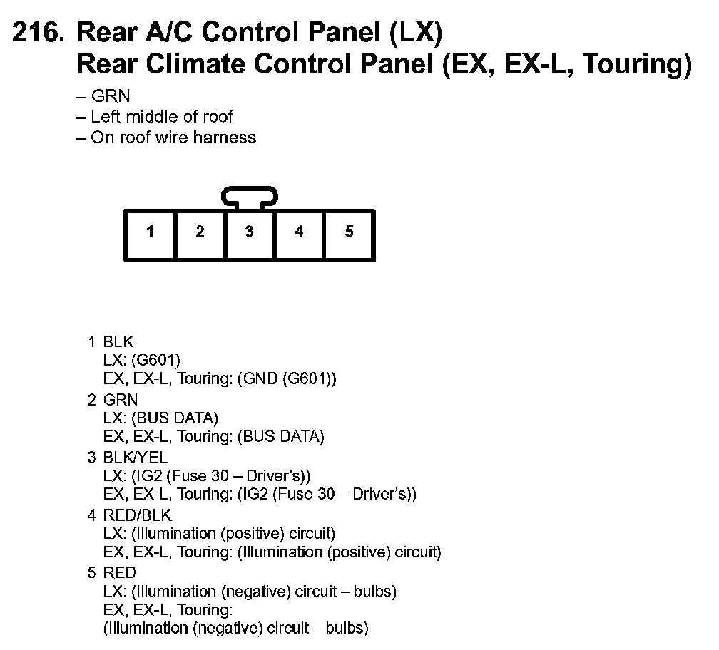216. Rear A/C Control Panel (LX) Rear Climate Control Panel (EX, EX-L, Touring):