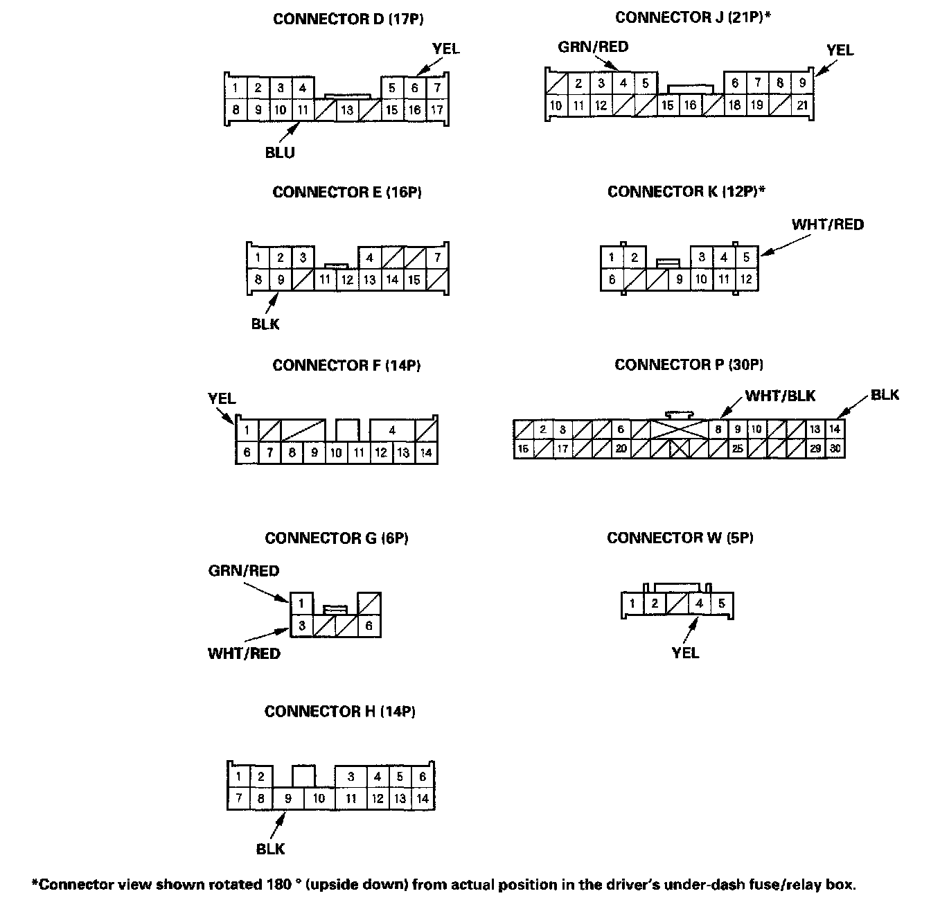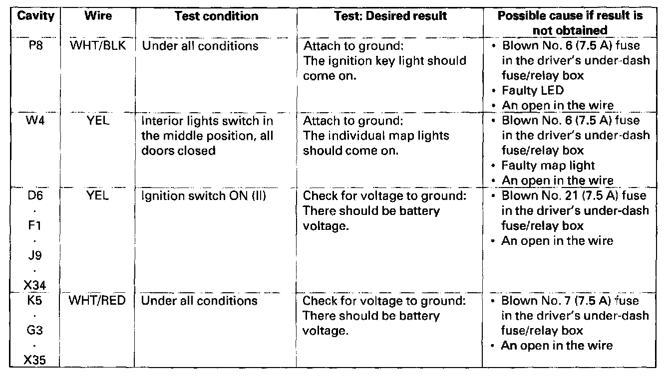 5. Reconnect the connectors to the driver's under-dash fuse/relay box, and make sure these input tests at the appropriate connectors on the driver's under-dash fuse/relay box.