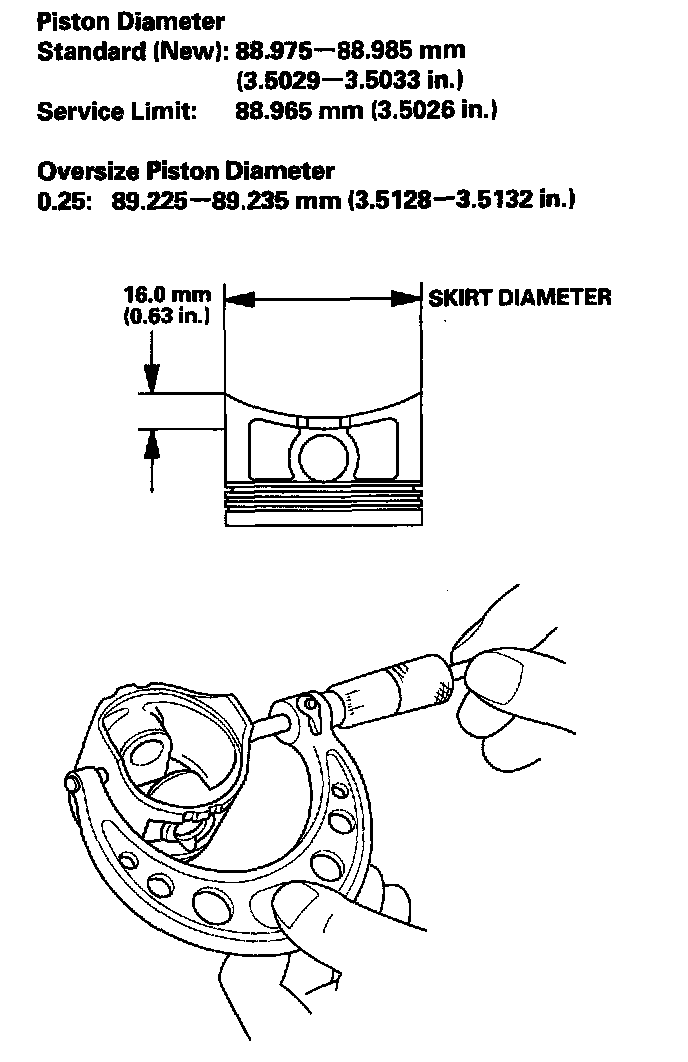 Measure the piston diameter at a point 16.0 mm (0.63 inch) from the bottom of the skirt.