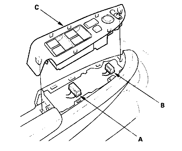 2. Remove the screw and disconnect the 23P connector (A) and 13P connector (B) from the master switch panel (C), then remove the switch assembly from the door panel.