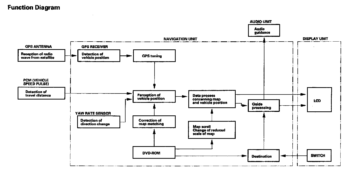 The navigation unit calculates the vehicle position and guides you to the destination. The unit performs map matching correction, GPS correction, and distance tuning. It also controls the menu functions and the DVD-ROM drive. With control of all these items, the navigation unit makes the navigation picture signal, then it transmits the signal to the display unit and audio driving instructions to the audio unit.