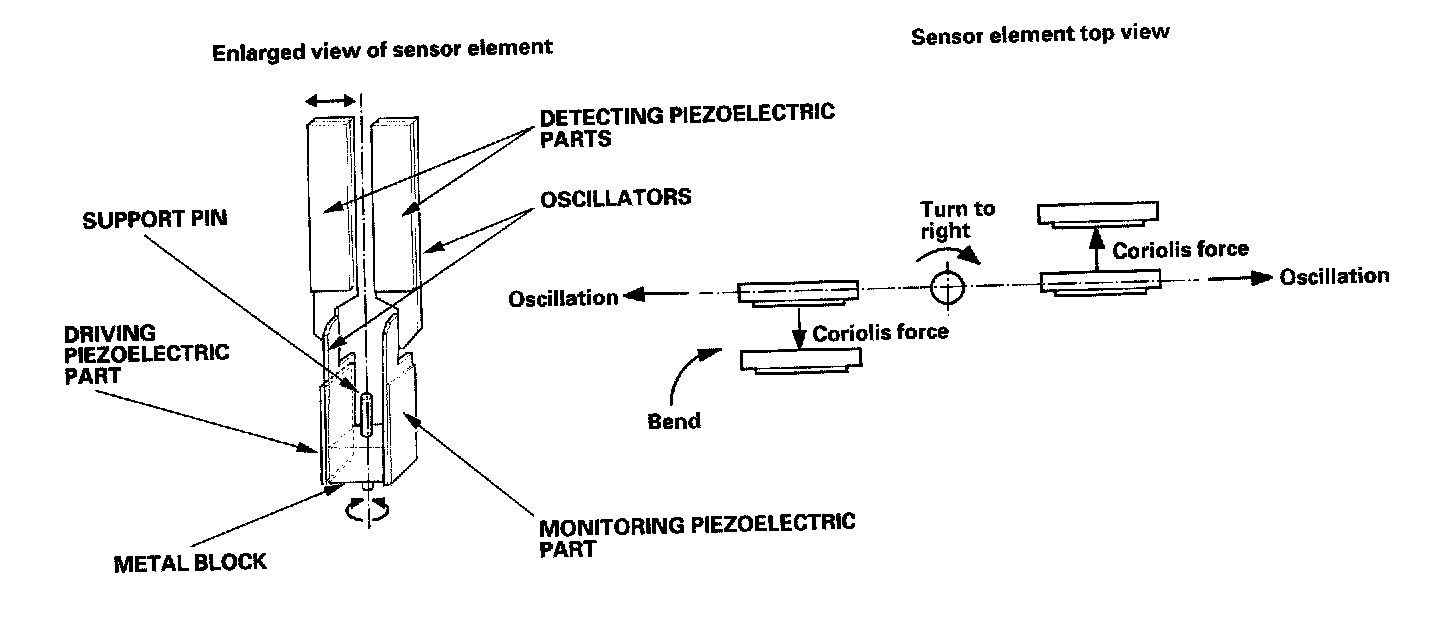 The piezoelectric parts have "electric/mechanical transfer characteristics." They bend vertically when voltage is applied to both sides of the parts, and voltage is generated between both sides of the piezoelectric parts when they are bent by an external force. The oscillation gyro functions by utilizing this characteristic of the piezoelectric parts and "Coriolis force." (Coriolis force deflects moving objects as a result of the earth's rotation.) In the oscillation gyro, this force moves the sensor element when angular velocity is applied.