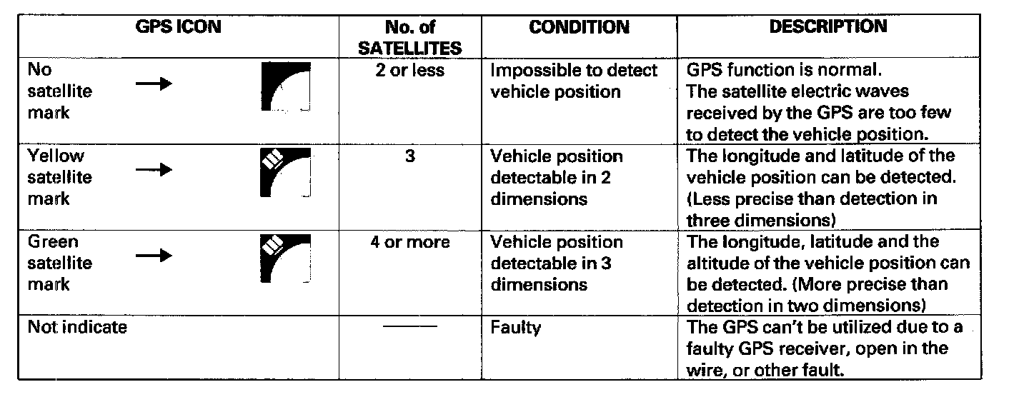 The global positioning system (GPS) enables the navigation system to determine the current position of the vehicle by utilizing the electric waves transmitted from the satellites in orbit around the earth. The satellites transmit the satellite identification signal, orbit information, transmission time signal, and other information. When the GPS receiver receives the electric waves from three or more satellites simultaneously, it calculates the current position of the vehicle based on the distance to each satellite and the satellite positions on their respective orbits.