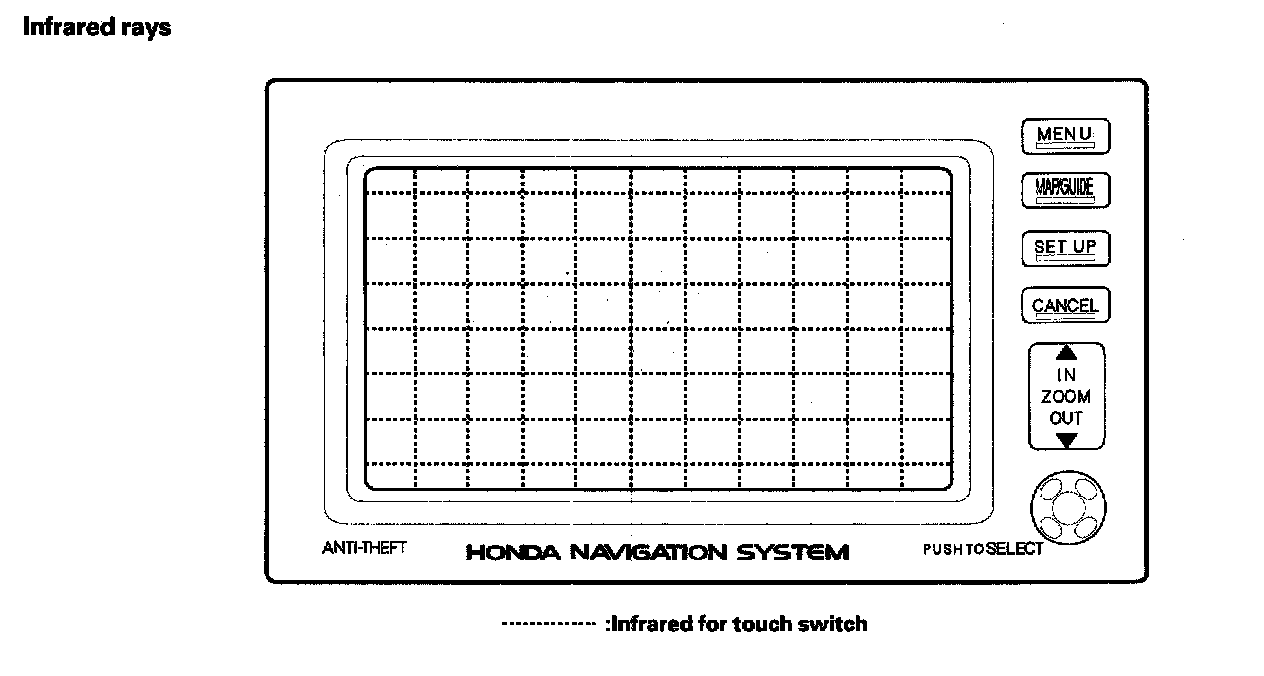 The display unit uses liquid crystal display (LCD). The LCD is a 6-inch-wide, thin film transistor (TFT), stripe type with 280,800 picture elements. The color film and fluorescent light are laid out on the back of the liquid crystal film. The touch sensor on the front of the LCD is an infrared type with 10 vertical and 7 horizontal infrared rays to produce 70 sensing points. The display unit transmits the signal from each operation key and the touch switches to the navigation unit.