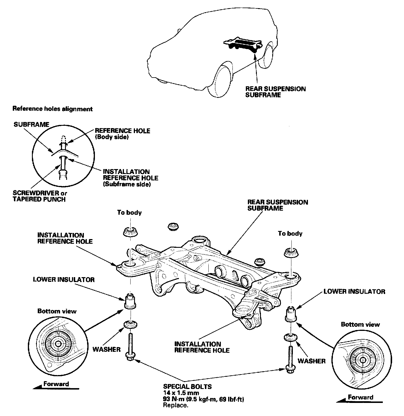 After removing the subframe mounting bolts, be sure to replace them with new ones.