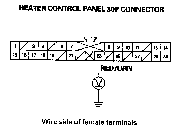 9. Measure the voltage between the No. 23 terminal of the heater control panel 30P connector and body ground.